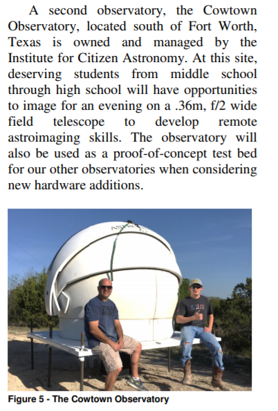 Cowtown Observatory is a 7' Astro Haven Clamshell dome. Inside is a pier mounted Skywatcher EQ6-R Pro Equatorial Mount. A variety of telescopes are available including a Celestron 8" RASA, Celestron NexStar 8SE, and Skywatcher Evostar 150mm APO Refractor. Imaging is accomplished with a ZWO asi071mc-pro or ZWO asi224mc CMOS camera.